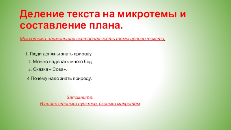Слайд 8Деление текста на микротемы и составление плана.