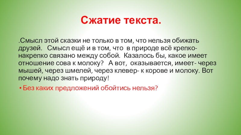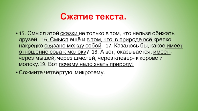 15. Смысл этой сказки не только в том, что нельзя обижать друзей. 16. Смысл ещё и в том, что в природе всё крепко- накрепко связано между собой. 17. Казалось бы, какое имеет отношение сова к молоку? 18. А вот, оказывается, имеет - через мышей, через шмелей, через клевер- к корове и молоку.19. Вот почему надо знать природу!
