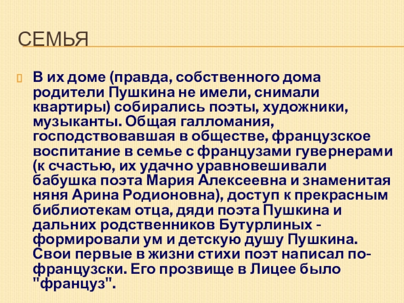 квартиры) собирались поэты, художники, музыканты. Общая галломания, господствовавшая в обществе, французское воспитание в семье с французами гувернерами (к счастью, их удачно уравновешивали бабушка поэта Мария Алексеевна и знаменитая няня Арина Родионовна), доступ к прекрасным библиотекам отца, дяди поэта Пушкина и дальних родственников Бутурлиных - формировали ум и детскую душу Пушкина. Свои первые в жизни стихи поэт написал по-французски. Его прозвище в Лицее было "француз".