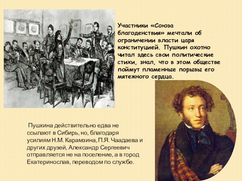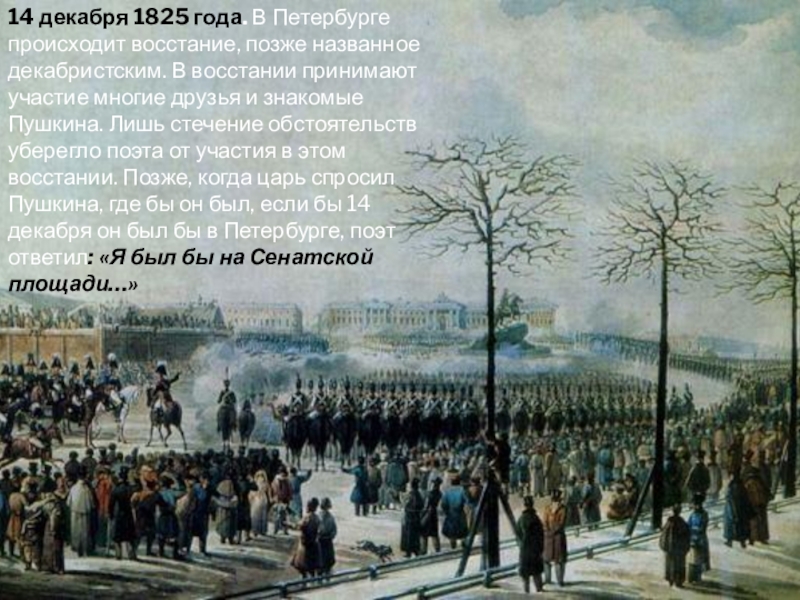 В восстании принимают участие многие друзья и знакомые Пушкина. Лишь стечение обстоятельств уберегло поэта от участия в этом восстании. Позже, когда царь спросил Пушкина, где бы он был, если бы 14 декабря он был бы в Петербурге, поэт ответил: «Я был бы на Сенатской площади…»