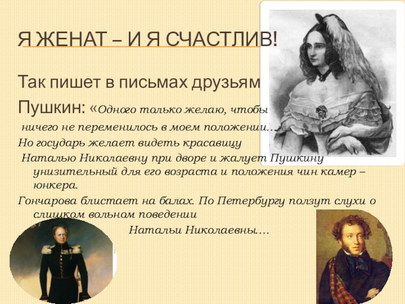 Наталью Николаевну при дворе и жалует Пушкину унизительный для его возраста и положения чин камер – юнкера.