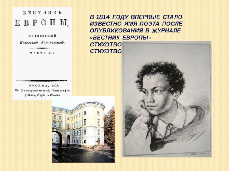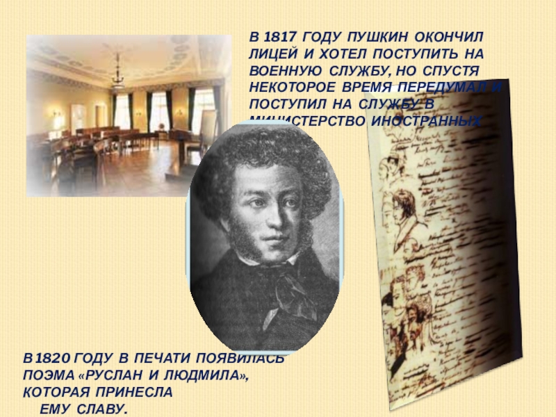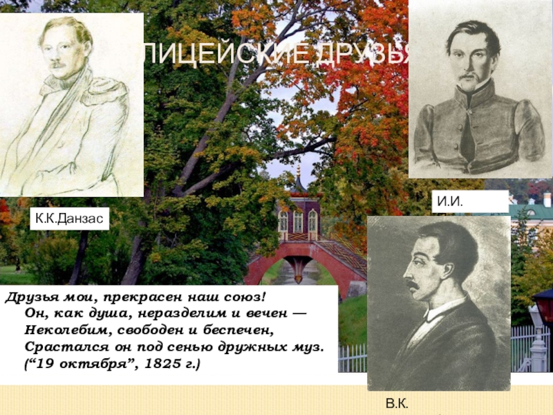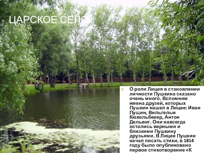Вспомним имена друзей, которых Пушкин нашел в Лицее: Иван Пущин, Вильгельм Кюхельбекер, Антон Дельвиг. Они навсегда остались верными и близкими Пушкину друзьями. В Лицее Пушкин начал писать стихи, в 1814 году было опубликовано первое стихотворение «К другу стихотворцу».