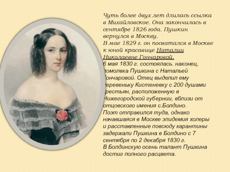 6 мая 1830 г. состоялась. наконец, помолвка Пушкина с Натальей Гончаровой. Отец выделил ему деревеньку Кистеневку с 200 душами крестьян, расположенную в Нижегородской губернии, вблизи от отцовского имения с.Болдино.