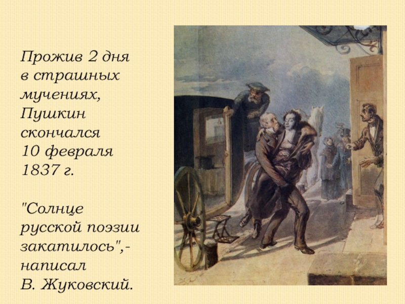 8 февраля 1837 года, в 5-м часу вечера, на Черной речке в Петербурге состоялась роковая дуэль, на которой Пушкин был смертельно ранен.