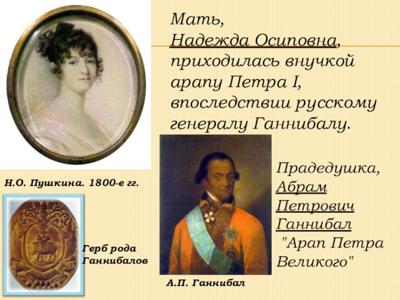 Надежда Осиповна, приходилась внучкой арапу Петра I, впоследствии русскому генералу