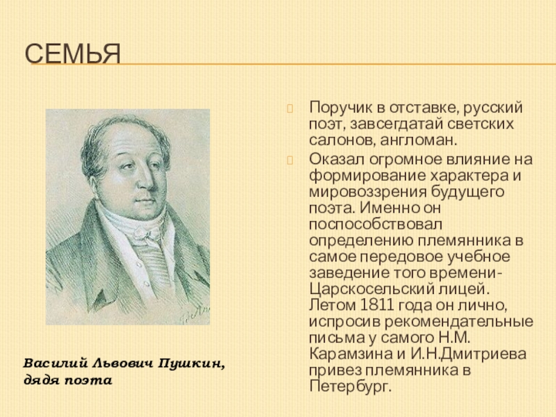 на формирование характера и мировоззрения будущего поэта. Именно он поспособствовал определению племянника в самое передовое учебное заведение того времени- Царскосельский лицей. Летом 1811 года он лично, испросив рекомендательные письма у самого Н.М.Карамзина и И.Н.Дмитриева привез племянника в Петербург.