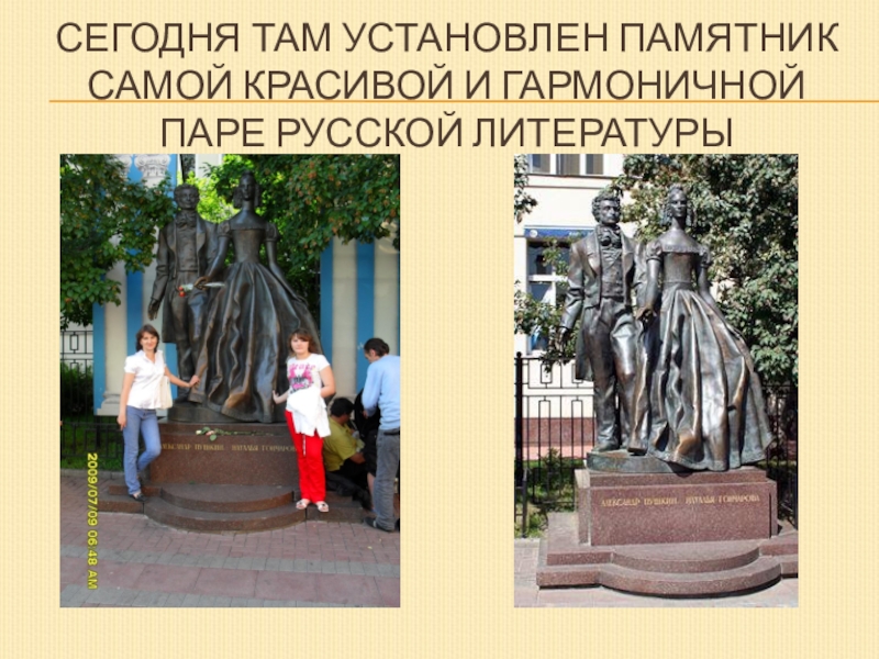 Слайд 39Сегодня там установлен памятник самой красивой и гармоничной паре русской литературы