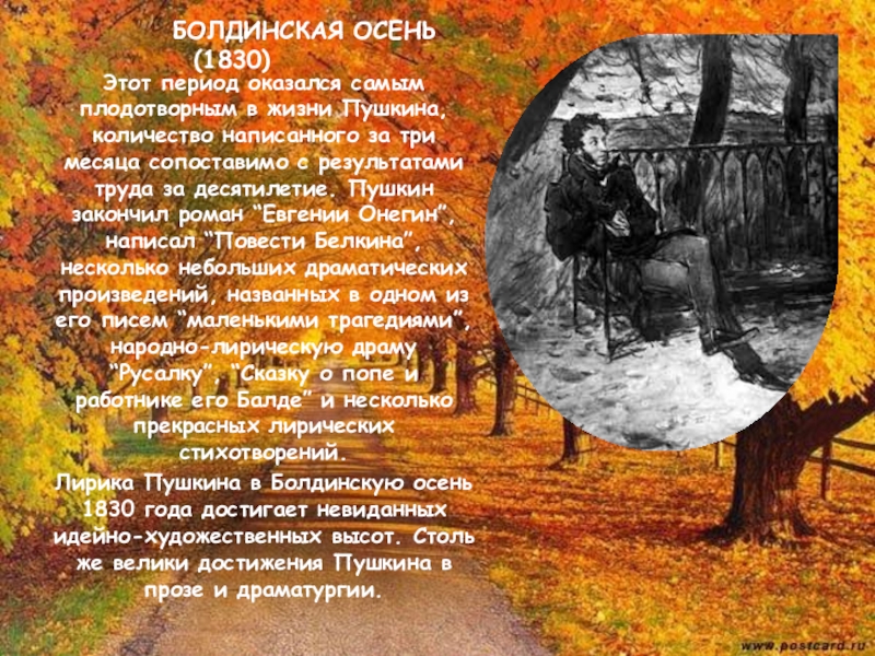 написанного за три месяца сопоставимо с результатами труда за десятилетие. Пушкин закончил роман “Евгении Онегин”, написал “Повести Белкина”, несколько небольших драматических произведений, названных в одном из его писем “маленькими трагедиями”, народно-лирическую драму “Русалку”, “Сказку о попе и работнике его Балде” и несколько прекрасных лирических стихотворений.