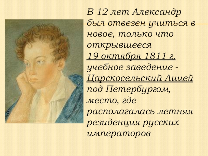 Слайд 14В 12 лет Александр был отвезен учиться в новое, только что