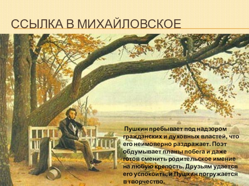 Слайд 34Чуть более двух лет длилась ссылка в Михайловское. Она закончилась в