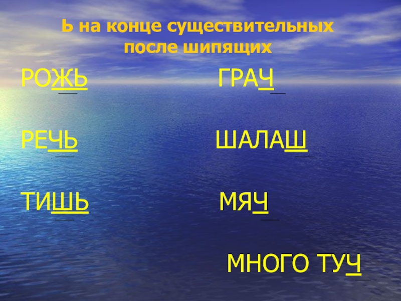 Ь на конце существительных после шипящихРОЖЬ ГРАЧРЕЧЬ ШАЛАШТИШЬ МЯЧ