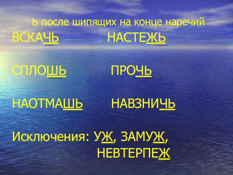 Ь после шипящих на конце наречийВСКАЧЬ      НАСТЕЖЬСПЛОШЬ