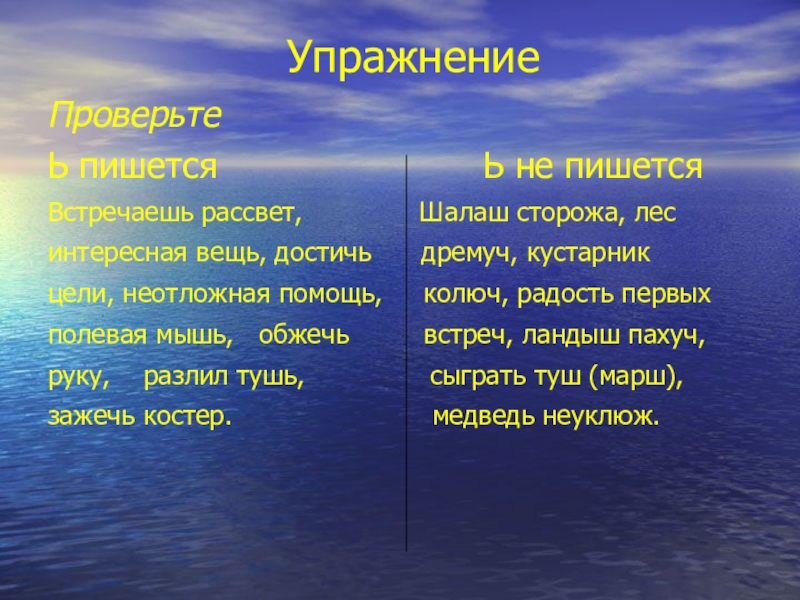 УпражнениеПроверьтеЬ пишется            Ь не пишетсяВстречаешь рассвет,