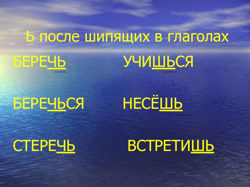 Ь после шипящих в глаголахБЕРЕЧЬ      УЧИШЬСЯБЕРЕЧЬСЯ    НЕСЁШЬСТЕРЕЧЬ