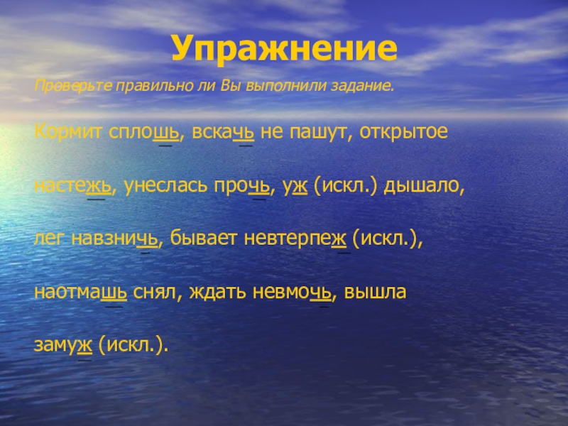 УпражнениеПроверьте правильно ли Вы выполнили задание.Кормит сплошь, вскачь не пашут, открытое настежь, унеслась прочь, уж (искл.) дышало,