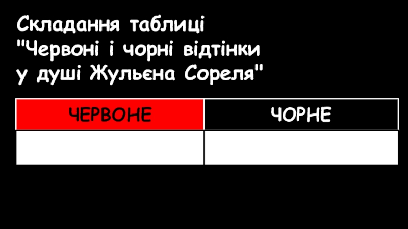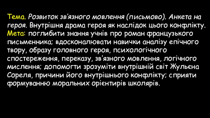 Мета: поглибити знання учнів про роман французького письменника; вдосконалювати навички аналізу епічного твору, образу головного героя, психологічного спостереження, переказу, зв’язного мовлення, логічного мислення; допомогти зрозуміти внутрішній світ Жульєна Сореля, причини його внутрішнього конфлікту; сприяти формуванню моральних орієнтирів школярів.