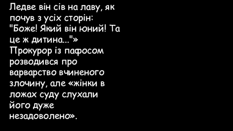 Прокурор із пафосом розводився про варварство вчиненого злочину, але «жінки в ложах суду слухали його дуже незадоволено».
