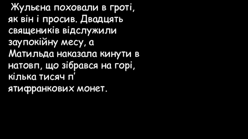 Слайд 90 Жульєна поховали в гроті, як він і просив. Двадцять священиків відслужили