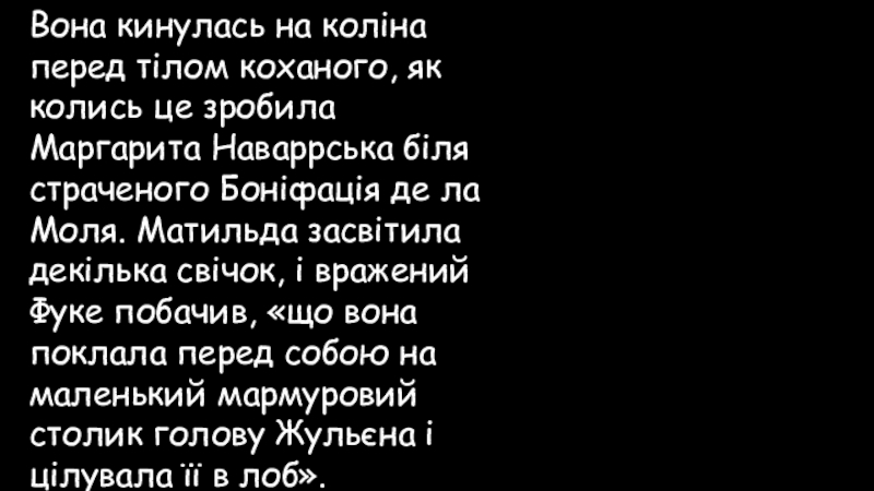 Маргарита Наваррська біля страченого Боніфація де ла Моля. Матильда засвітила декілька свічок, і вражений Фуке побачив, «що вона поклала перед собою на маленький мармуровий столик голову Жульєна і цілувала її в лоб».