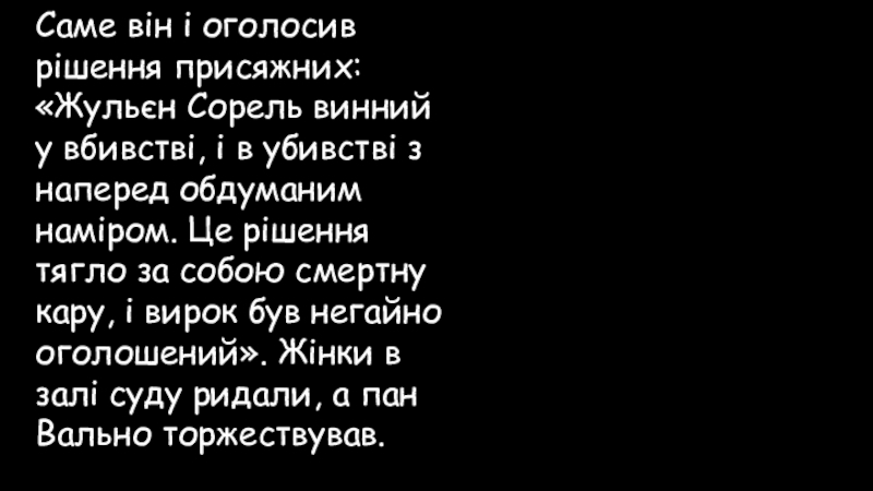Слайд 72Саме він і оголосив рішення присяжних: «Жульєн Сорель винний у вбивстві,