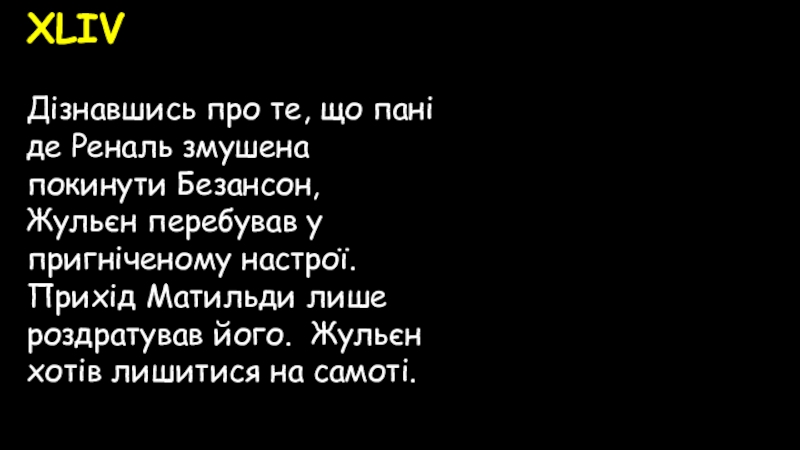 перебував у пригніченому настрої. Прихід Матильди лише роздратував його. Жульєн хотів лишитися на самоті.