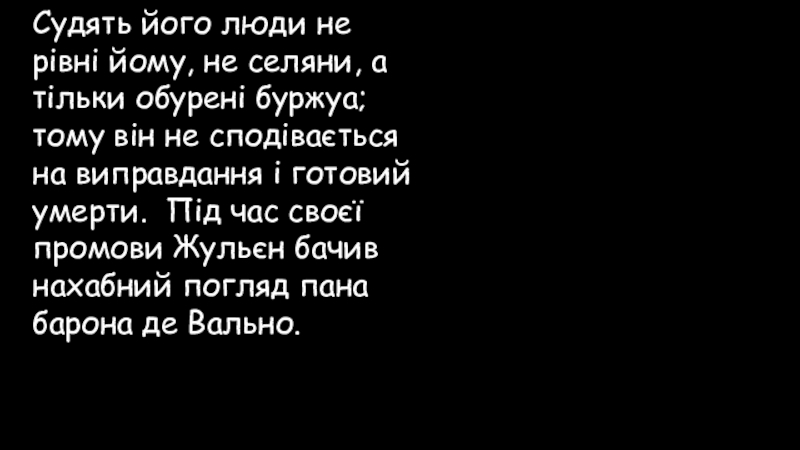 буржуа; тому він не сподівається на виправдання і готовий умерти. Під час своєї промови Жульєн бачив нахабний погляд пана барона де Вально.
