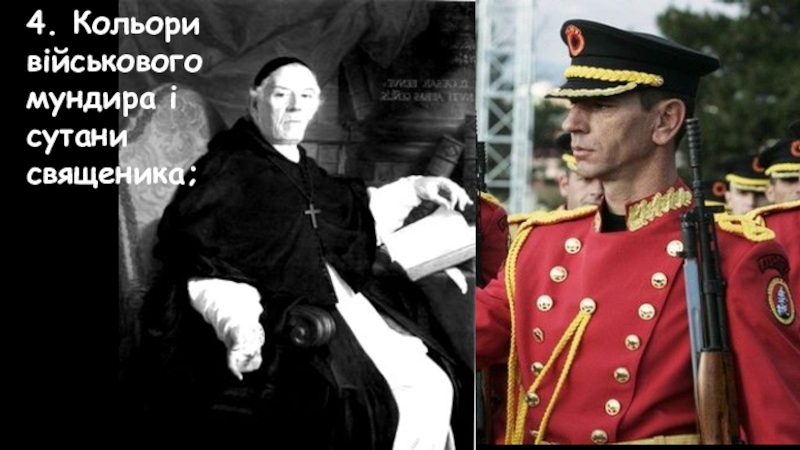 Слайд 994. Кольори військового мундира і сутани священика;
