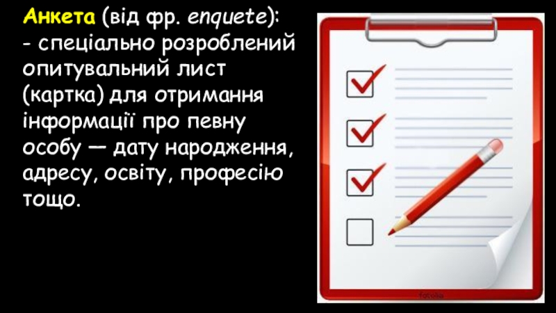 Слайд 19Анкета (від фр. enquete):