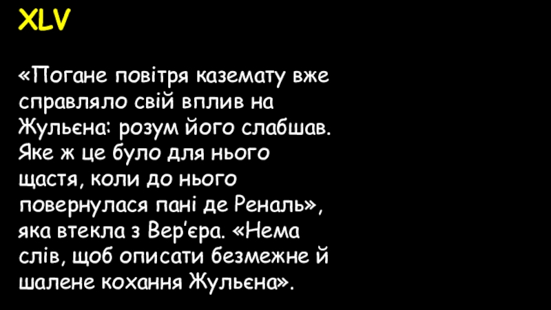 слабшав. Яке ж це було для нього щастя, коли до нього повернулася пані де Реналь», яка втекла з Вер’єра. «Нема слів, щоб описати безмежне й шалене кохання Жульєна».