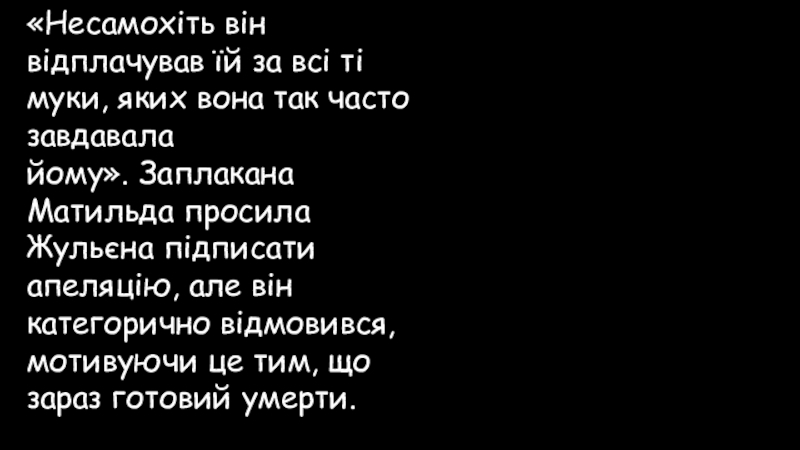 часто завдавала йому». Заплакана Матильда просила Жульєна підписати апеляцію, але він категорично відмовився, мотивуючи це тим, що зараз готовий умерти.
