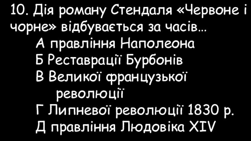 Слайд 1310. Дія роману Стендаля «Червоне і чорне» відбувається за часів…