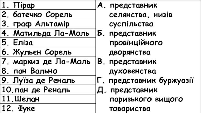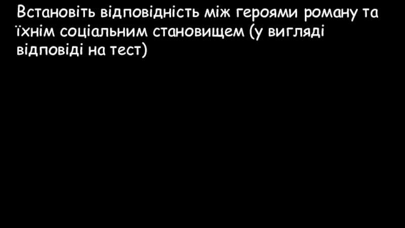 Слайд 32Встановіть відповідність між героями роману та їхнім соціальним становищем (у вигляді