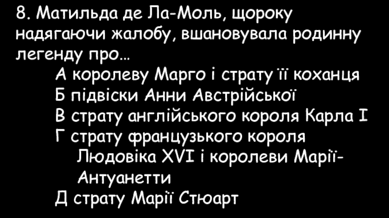 Слайд 248. Матильда де Ла-Моль, щороку надягаючи жалобу, вшановувала родинну легенду про…