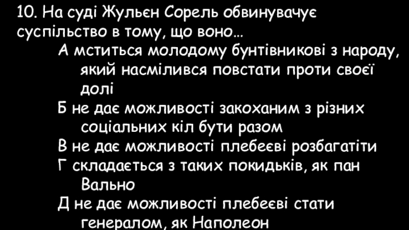 Слайд 2610. На суді Жульєн Сорель обвинувачує суспільство в тому, що воно…