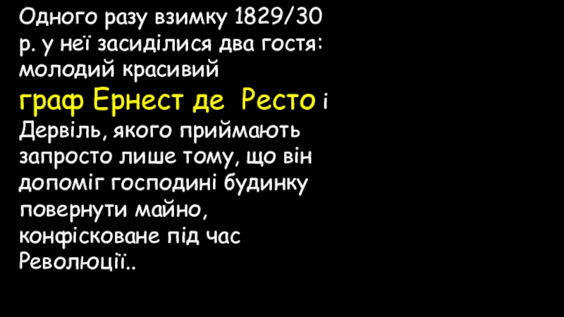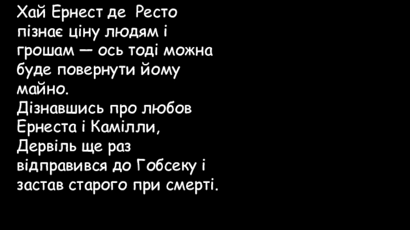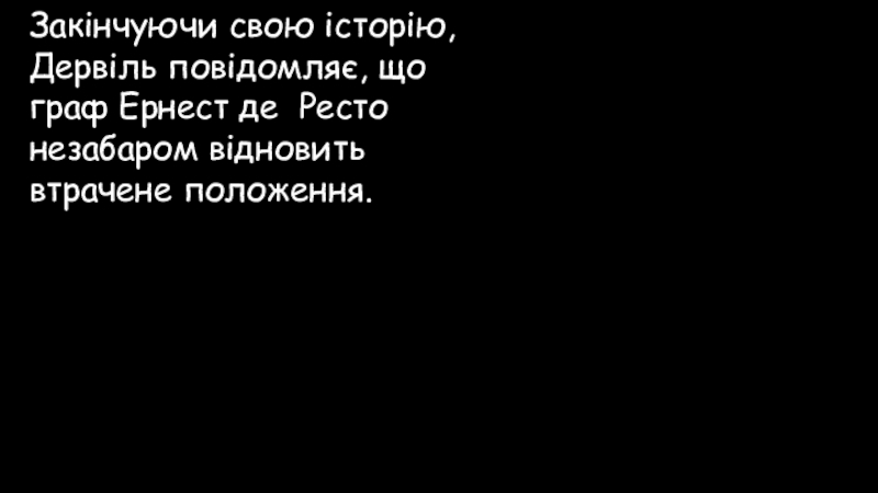 Слайд 82Закінчуючи свою історію, Дервіль повідомляє, що граф Ернест де Ресто незабаром