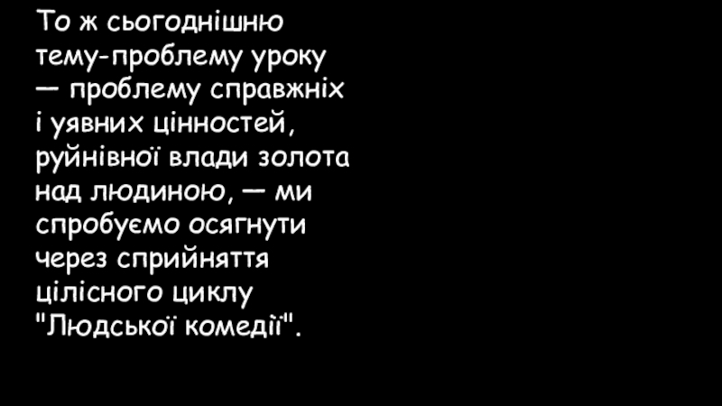 руйнівної влади золота над людиною, — ми спробуємо осягнути через сприйняття цілісного циклу "Людської комедії".