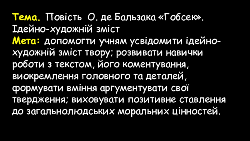 Слайд 17Тема. Повість О. де Бальзака «Гобсек». Ідейно-художній зміст