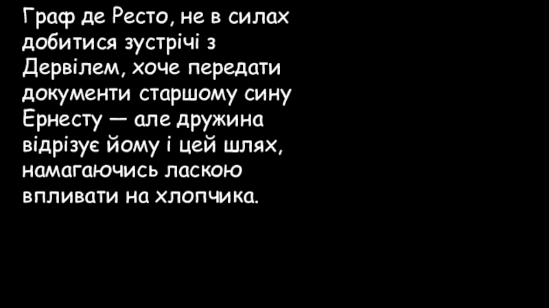 Слайд 73Граф де Ресто, не в силах добитися зустрічі з Дервілем, хоче