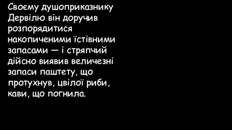 Слайд 80Своєму душоприказнику Дервілю він доручив розпорядитися накопиченими їстівними запасами — і