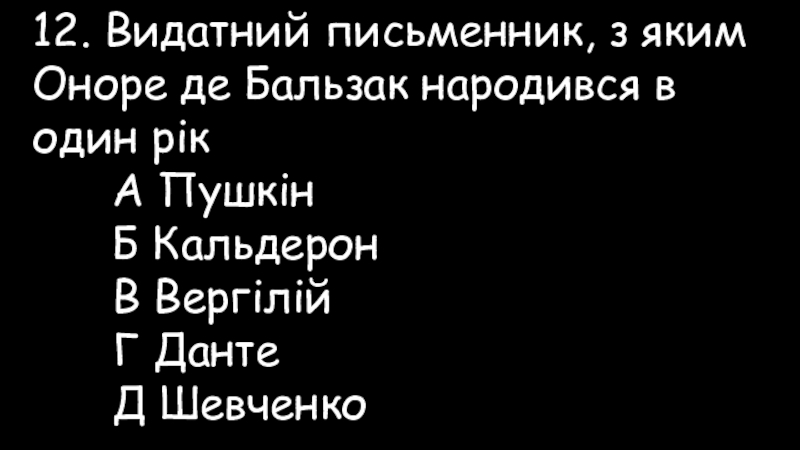 Слайд 1412. Видатний письменник, з яким Оноре де Бальзак народився в один