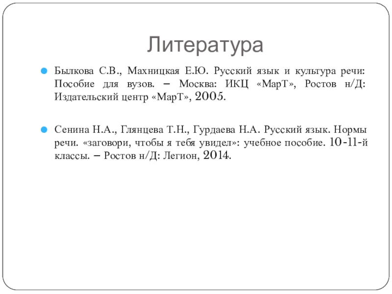 Сенина Н.А., Глянцева Т.Н., Гурдаева Н.А. Русский язык. Нормы речи. «заговори, чтобы я тебя увидел»: учебное пособие. 10-11-й классы. – Ростов н/Д: Легион, 2014.
