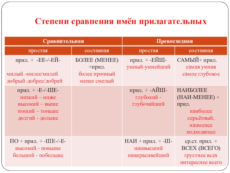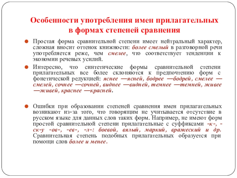 Ошибки при образовании степеней сравнения имен прилагательных возникают из-за того, что говорящим не учитывается отсутствие в русском языке для данных слов таких форм. Например, не имеют форм простой сравнительной степени прилагательные с суффиксами -к-, -ск-у -ов-, -ев-, -л-: боевой, вялый, маркий, вражеский и др. Сравнительная степень подобных прилагательных образуется при помощи слов более и менее.