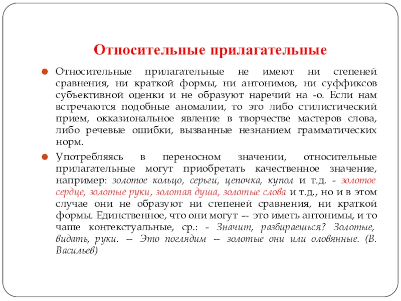 Употребляясь в переносном значении, относительные прилагательные могут приобретать качественное значение, например: золотое кольцо, серьги, цепочка, купол и т.д. - золотое сердце, золотые руки, золотая душа, золотые слова и т.д., но и в этом случае они не образуют ни степеней сравнения, ни краткой формы. Единственное, что они могут — это иметь антонимы, и то чаше контекстуальные, ср.: - Значит, разбираешься? Золотые, видать, руки. — Это поглядим — золотые они или оловянные. (В. Васильев)