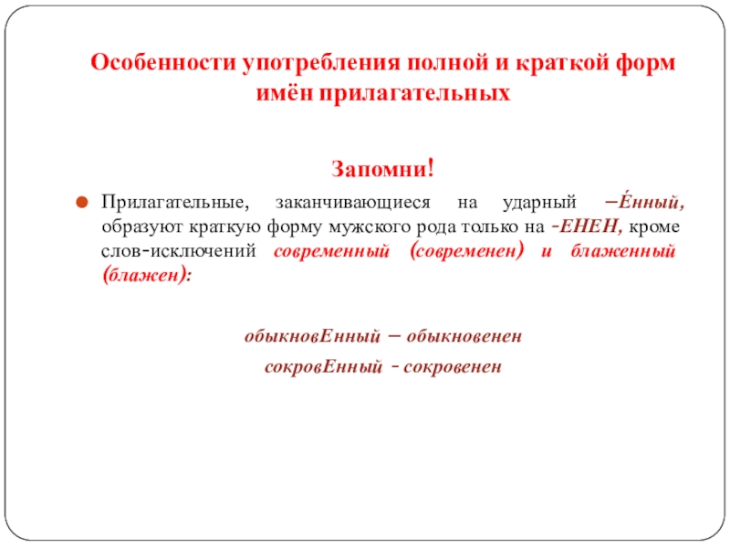 ударный –Е́нный, образуют краткую форму мужского рода только на -ЕНЕН, кроме слов-исключений современный (современен) и блаженный (блажен):