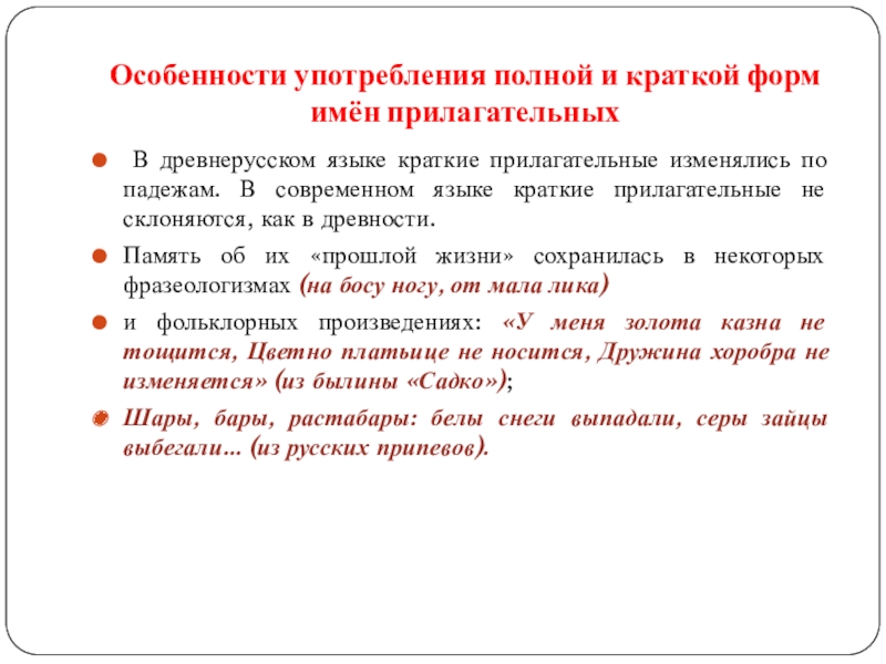 краткие прилагательные изменялись по падежам. В современном языке краткие прилагательные не склоняются, как в древности.