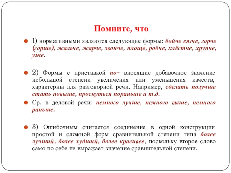 1) нормативными являются следующие формы: бойче вязче, горче (горше), жальче,