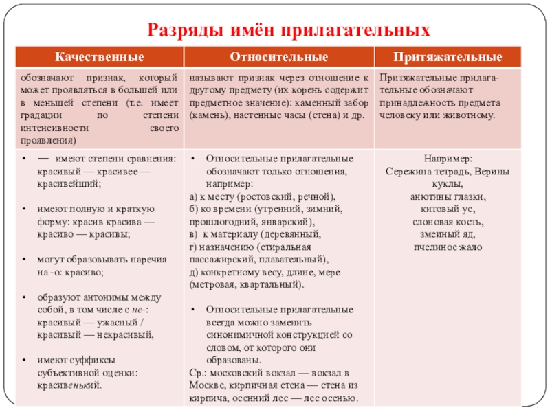По значению различают разряды прилагательных: качественные, относительные и притяжательные.