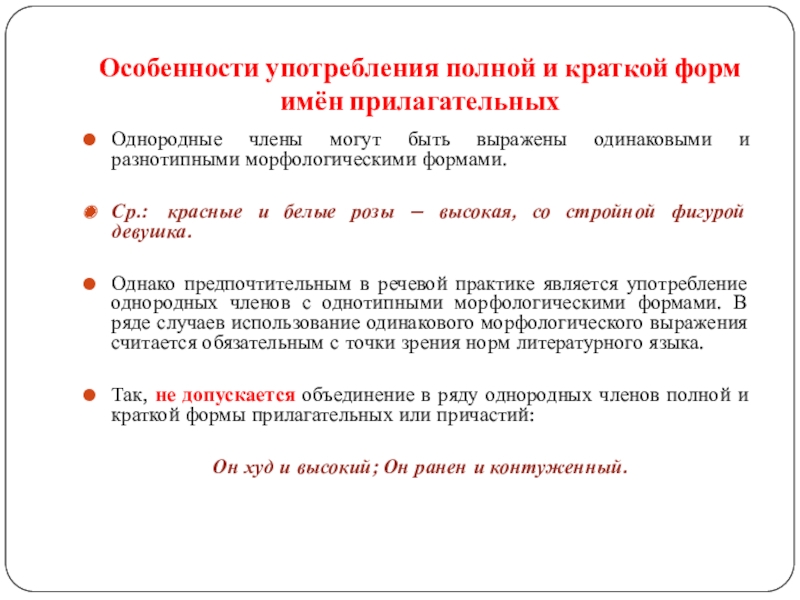 Так, не допускается объединение в ряду однородных членов полной и краткой формы прилагательных или причастий:
