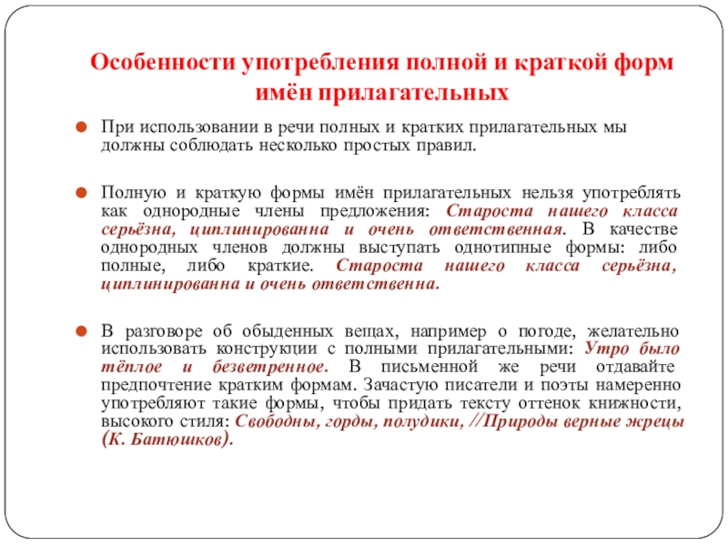 Слайд 13Особенности употребления полной и краткой форм имён прилагательных