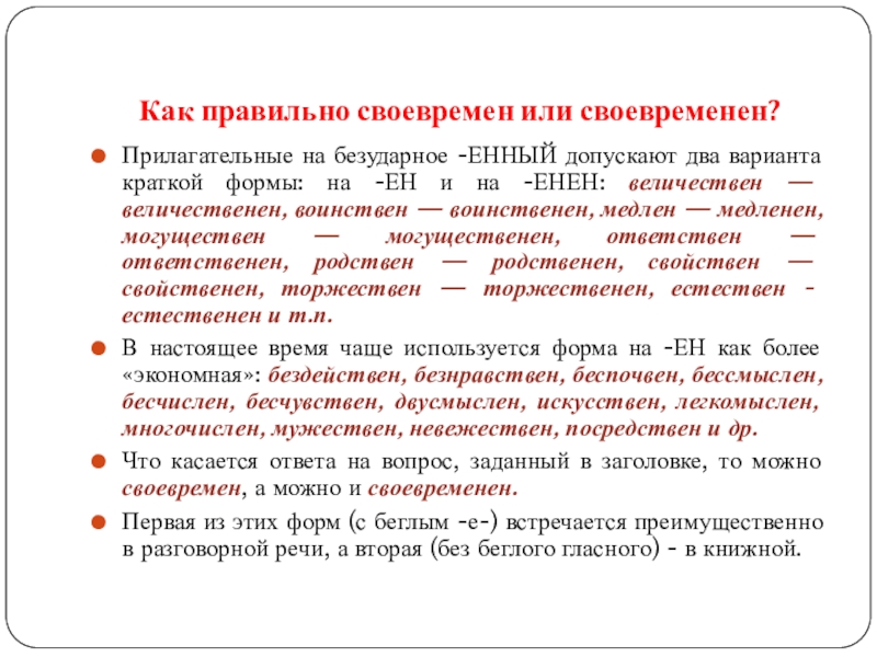 Прилагательные на безударное -ЕННЫЙ допускают два